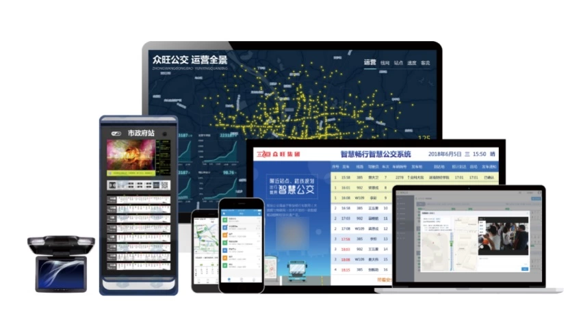 智慧公交云平台支持城市监控大屏、场站调度展示屏、现场调度管理系统、移动调度APP、乘客出行APP、站点路牌、车载智能显示终端七维一体应用,可实现公交运营“一张图、一张网、一张表、一张屏”的统一运营管理,打通各部门之间的管理隔阂。