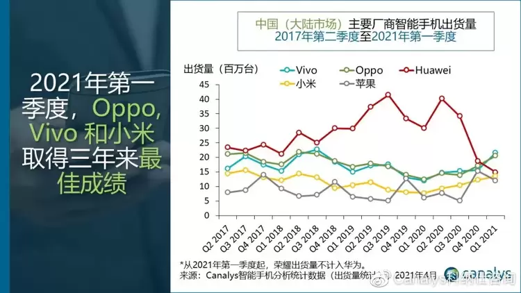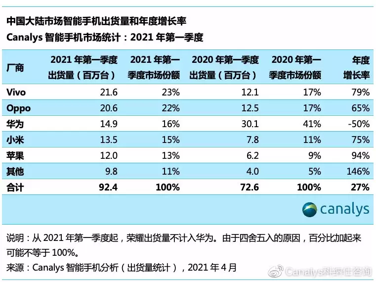近些年,全球智能手机市场由于创新速度放缓和消费者购机欲望下降等因素,出货量呈现出了整体下滑的趋势,去年突如其来的特殊情况更是让整个智能手机行业雪上加霜。而由于中国的管控得当,今年中国智能手机市场率先复苏,并重拾了往日的繁荣。知名市场调研机构Canalys在前不久发布报告表示,2021年一季度中国智能手机市场的出货量达到了9240万部,同比增长27%。其中国产手机厂商vivo的出货量同比猛增79%,达到2160万台,成为了中国智能手机市场出货量最高的品牌。而vivo之所以崛起火爆销量,离不开大环境的影响和自身的努力。
