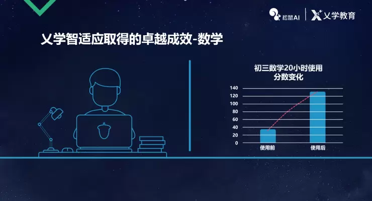 还有一位同学,他之前上过很多辅导班,也使用了各种产品,但英语成绩一直没什么提升。用了我们的产品后,在没有任何老师干预的情况下,依靠自主学习成绩从63分提升到了120分。最后受到副校长的全校表扬,当时学校只表扬了两名学生,一名是个学霸,另一名就是他。