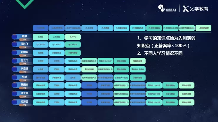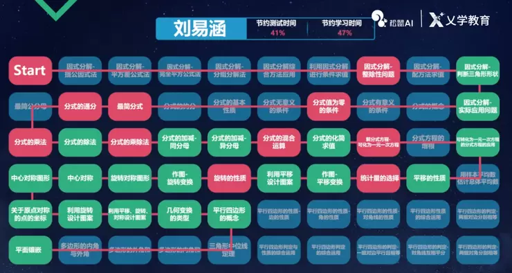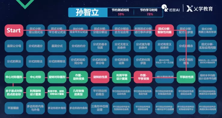 我们的AI老师还可以做前瞻式判断。学生要完成某个学习目标,我们会先判断他当前是否有能力完成这个目标。比如某个学生学习一元二次方程,我们会看他的分解和一次方程是否学好了。如果没有学好,就先学习这些薄弱的基础知识点。只有熟练掌握这些前提知识点,他才能完成学习目标。