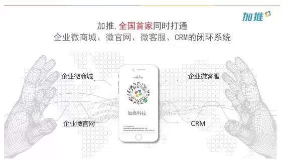 我们首创了“小程序名片+SCRM+AI”的产品形式,打通企业微官网、微商城、微客服和CRM四大销售系统,帮助企业快速完成品牌升级和销售赋能。虽然加推背后是众多的系统,但落地的方式却很轻。