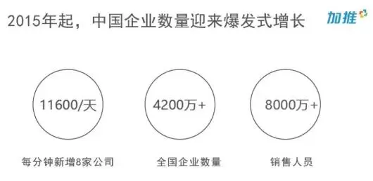 2015年,国内的企业数大概还是2000多万家,随着这几年国家大众创业,万众创新政策的倡导,中国现在已经有超过4200万家中小企业,平均每分钟新增约8家公司。