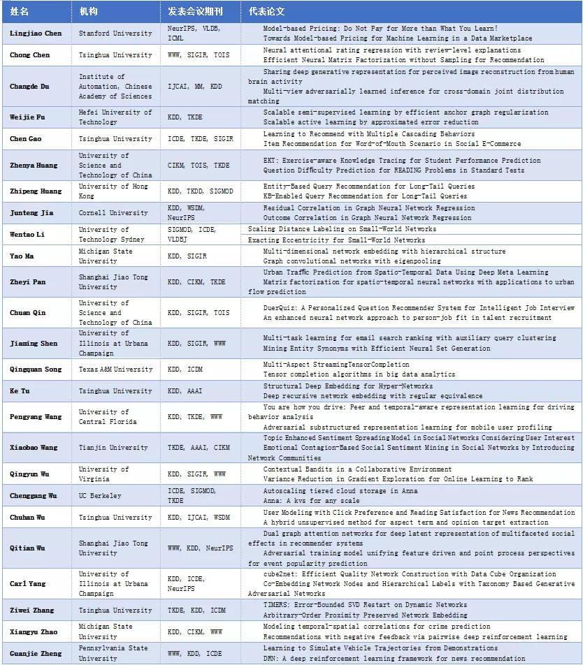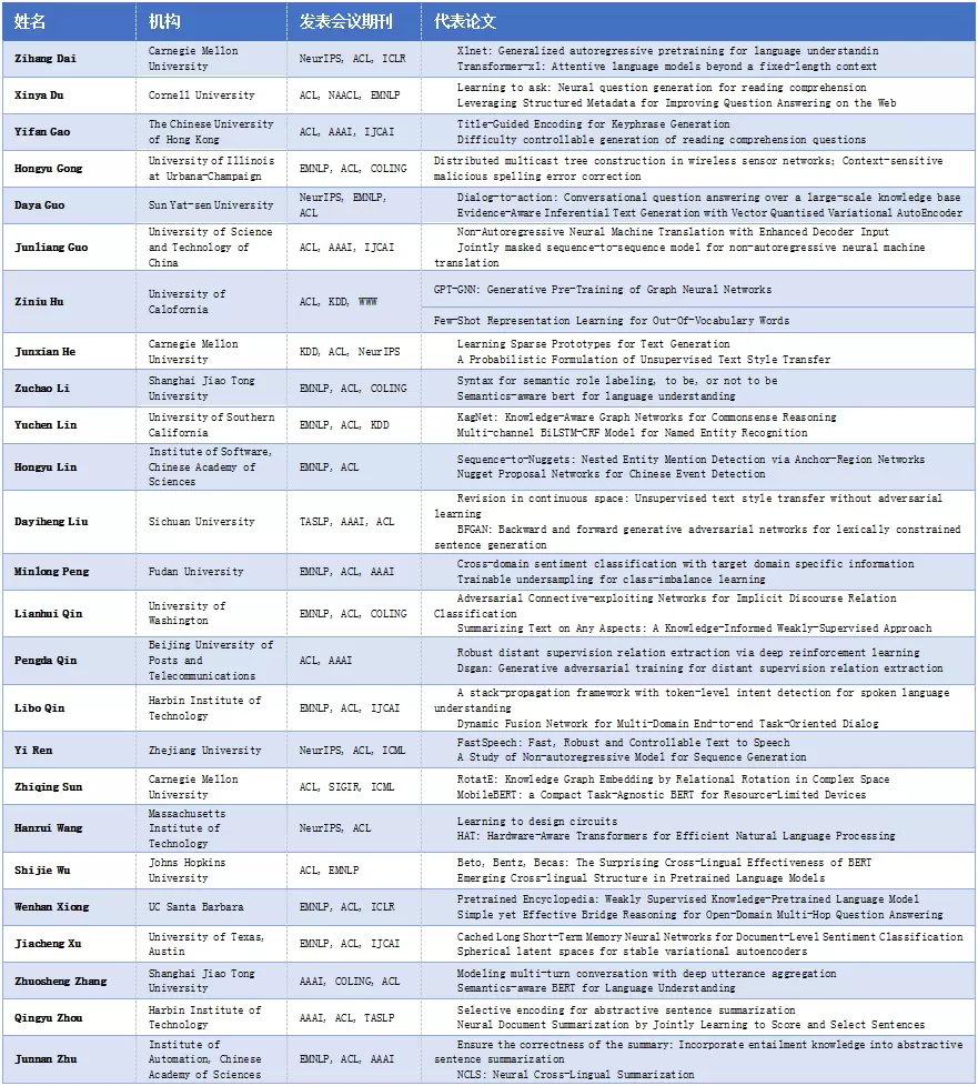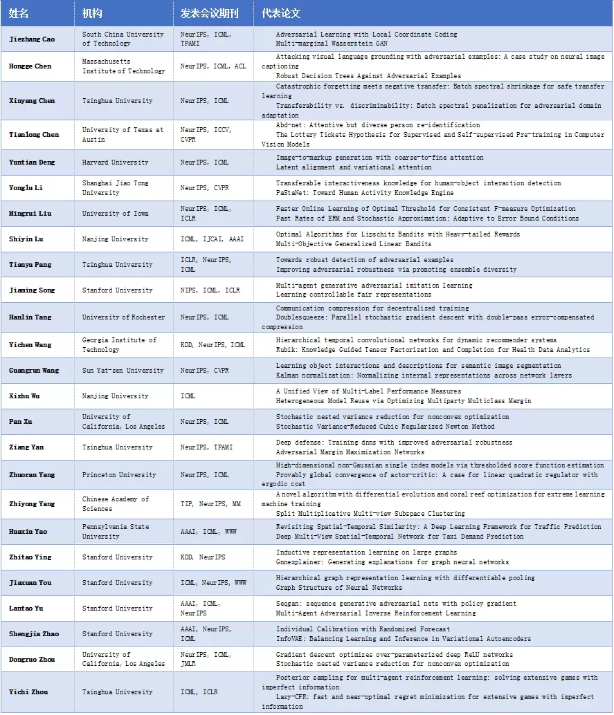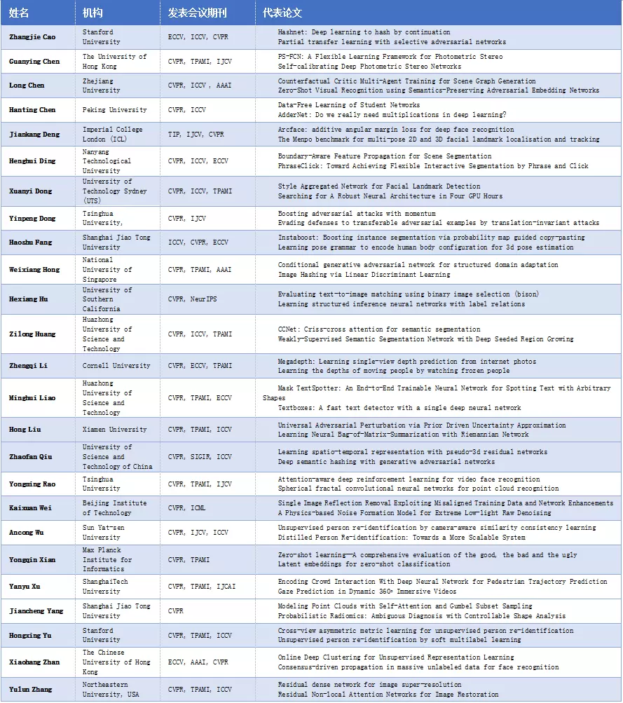 榜单面向全世界范围内在读的AI领域华人学生群体(毕业时间不早于2020年), 基于学生在读期间发表的所有论文数据,共包括人工智能领域55个国际顶级期刊会议收录的65255篇论文,以及45205名学生数据。评选以学术水平、学术影响力、学术潜力指数三个维度,利用大数据挖掘技术、自动化评估方法生成榜单。参考中国计算机学会(CCF)推荐的学科分类标准以及国内学者专家建议,从计算机视觉、机器学习、自然语言处理、数据挖掘四个领域各筛选25名青年学生(共计100名),入选学生排序不分先后,以姓氏拼音首字母进行排序。