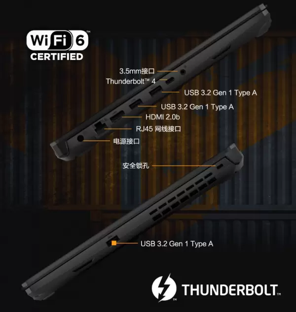 得益于11代酷睿的加入,飞行堡垒9还为玩家配置了最新的Thunderbolt™ (雷电)4接口。雷电4接口拥有至高40Gbps的外联速度,不仅为手柄、机械键盘、可编程鼠标等各种游戏外设提供了高速率、低延迟的连接支持,还可让用户以 60Hz 的刷新率接入两台 4K 显示器,或一台 8K UHD 大屏电视,随心组合自己的外接屏幕方案。