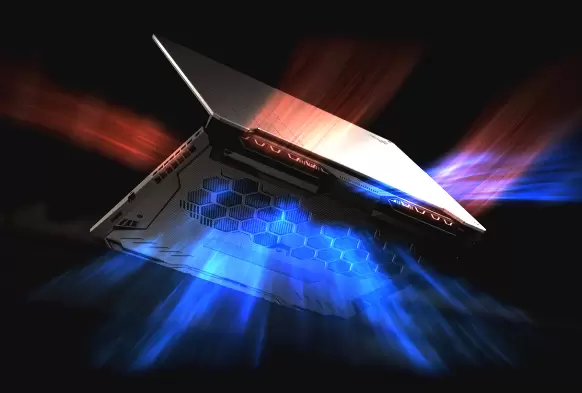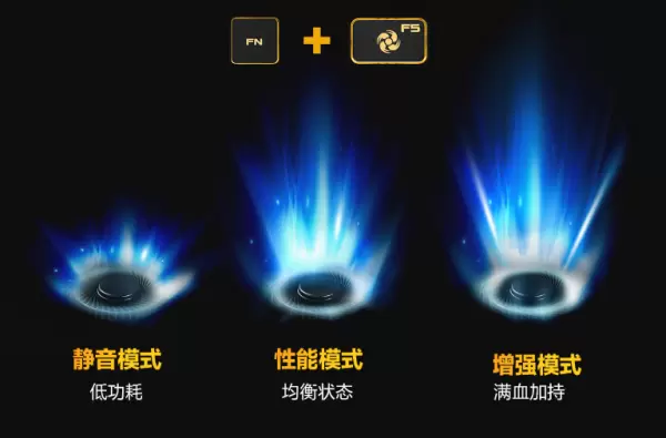 A面的梯形切割配合多散热鳍片,加上底部的蜂窝造型设计,还能进一步提升内部热空气的交换效率。FN+F5即可在暴风增压预设的多种散热模式中无缝切换,其中静音模式下,当CPU和GPU温度低于60°时,风扇将完全关闭,让玩家在处理简单任务如看图片、写文稿的时候,能够避免噪音带来的干扰。