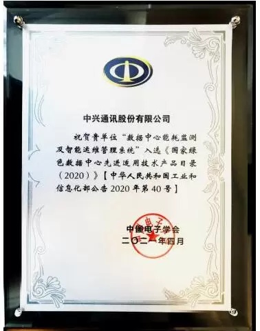 中兴通讯iDCIM入选“2020年国家绿色数据中心先进适用技术产品”