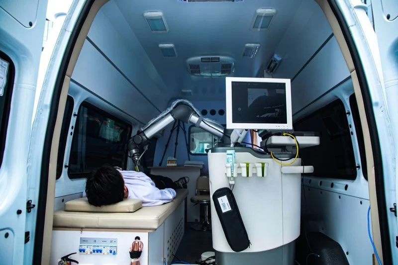 “5G远程超声机器人移动车”可以面向缺少专业检测设备或检查人员等地区,提高超声诊断的普及性,打造可移动式超声检查服务站。超声机器人移动车的诞生,将如同给机器人添加了一对“翅膀”,哪里有需要便开到哪里,使得超声检查不再受限于医院、卫生院等医疗机构,犹如一个移动超声诊室。
