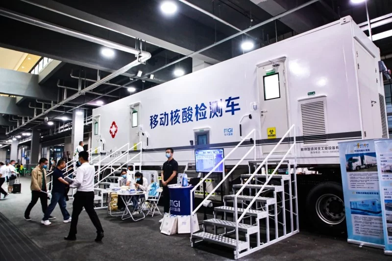 在本次展会上,华大智造还带来了与戴纳科技联合研发的移动核酸检测车,该车可以在突发性公共卫生事件发生时快速转运至任何指定地点,及时开展核酸检测工作,提升当地核酸检测能力,一经亮相便成了会展现场的“明星”。