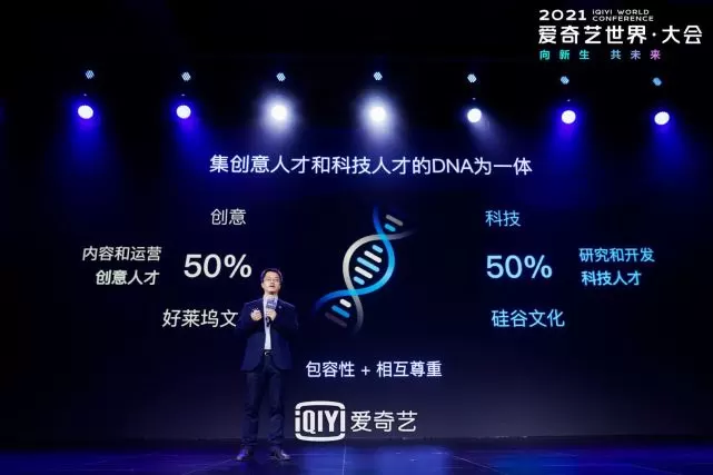 爱奇艺如何能够做好这两件事呢?我们很早就建立了企业文化的DNA。DNA实际上是由两条多脱氧核苷酸链连接而成,组成的是生命的基因密码,让生命可以一代一代的延续下去。而爱奇艺的DNA也有两条链条——创意和科技。创意类比于好莱坞文化,科技类比于硅谷文化,地理位置正好一北一南,通过互相包容、互相尊重,我们希望可以打造各种各样的人才,背景多样化的团队,进而够建生态,为用户服务。