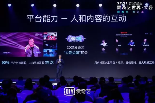 除了奇观,在“2021为爱尖叫晚会”上,爱奇艺在互动上的探索更进了一步。晚会创新性地采用一屏四看的观看方式,并将晚会的主导权交到用户手中,由他们决定演出顺序、返场艺人、观看视角、限定团体等精彩节目,舞台之间实时切换让观众感受到创意的空间被扩展。数据显示,90%用户进行了画面切换,人均切换画面达29次。这场晚会使用超大规模的超低延时直播,将时延缩短到5秒以内。