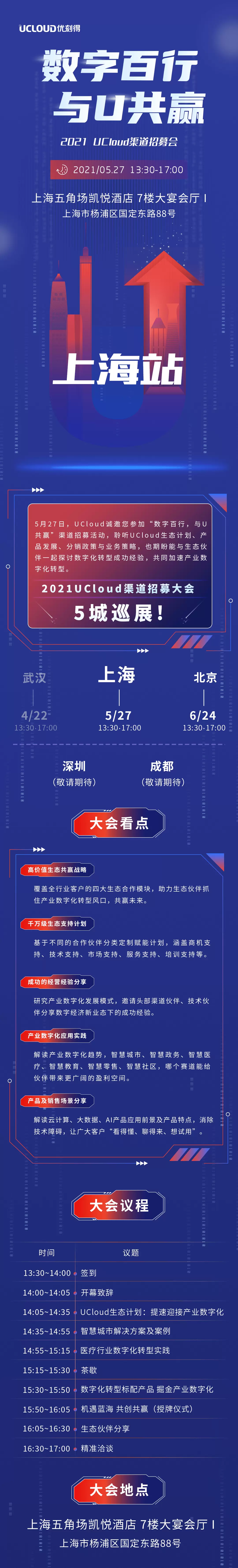 “数字百行,与U共赢”,2021UCloud优刻得渠道伙伴招募大会五城巡展将于5月27日登陆上海。