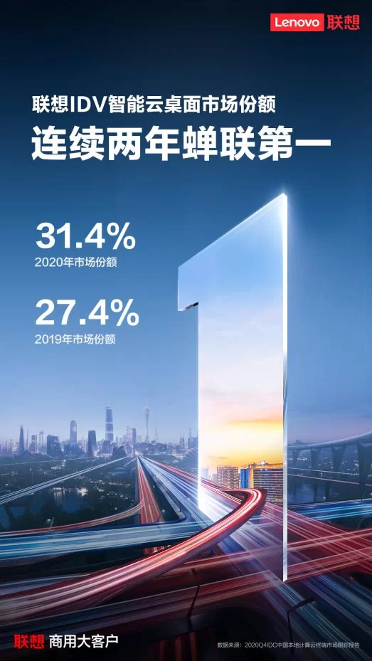 作为超能云终端的代表IDV和TCI是近年来最新兴起的解决方案,根据IDC报告最新数据,联想IDV智能云桌面连续夺得2019和2020市场份额第一名,并且在2020年度市场份额攀升至31.4%。取得该成绩的背后,是联想对行业痛点和应用场景的深入洞察和不断耕耘。面对终端日益增加的海量数据需求和应用需求,联想推出了基于IDV架构,面向行业的智能云桌面解决方案,极大地降低了设备管理维护的难度。