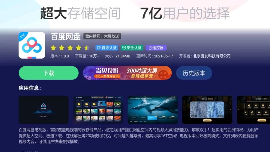 5月18日,百度网盘宣布推出“电视版”,正式入驻当贝智能电视应用商店。用户可从智能电视应用商店“当贝市场”下载该应用,在电视上享受“云看片”的畅爽大屏体验。目前,百度网盘已打通云端与电视、汽车、手表、路由器等多个智能终端,实现数据在多个场景的互联互通。