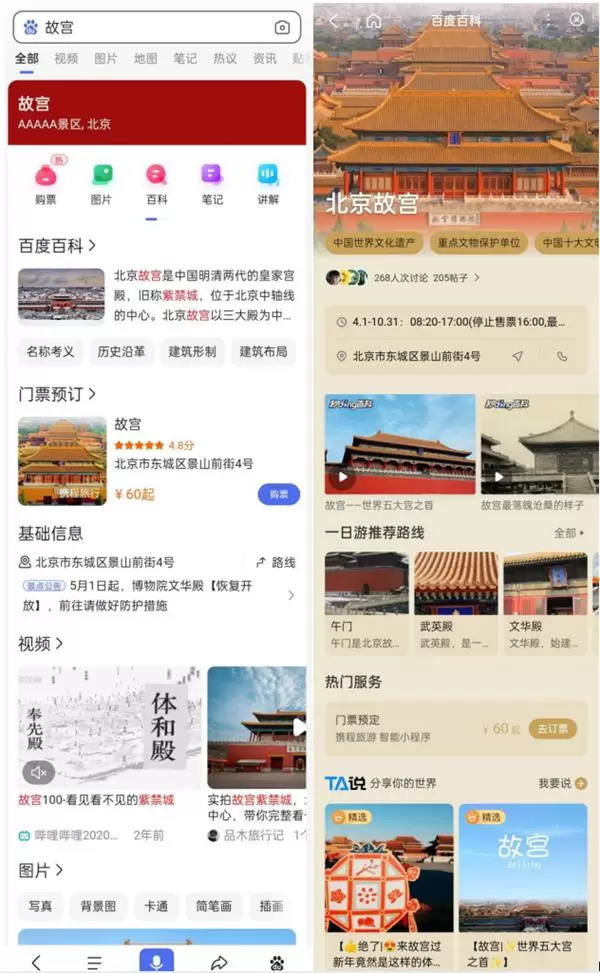 以用户在百度 App 搜索“故宫”为例,结果页不再是传统的图文信息,而是购票、视频、游记等综合服务。用户可以通过视频和讲解去了解故宫的知识,随即产生游览需求,而通过智能小程序即可直接购票,完成线下游玩。游览时,用户大概率还会对故宫的文创衍生品感兴趣,也能通过智能小程序下单购买。在这个过程中,实际上就是打通搜索+商业闭环带来的流量复用价值,知识流量也是电商流量,服务流量。如今,在百度搜索的内容中,依托于百度智能小程序的服务化内容占比大幅提升,用户在百度上每3次搜索结果就有1次由智能小程序承接。