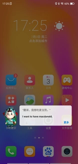 除此之外,“哈利”语音助手还可以帮助我们查看当地的天气、周边的美食、翻译、任务提醒等功能,真正的实现了手机的“AI”化。