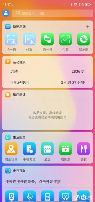 海信AI手机H20的负一屏被设计成了手机的信息中枢——快速启动、运动健康、稍后阅读、生活服务......都在此进行集中的展示。