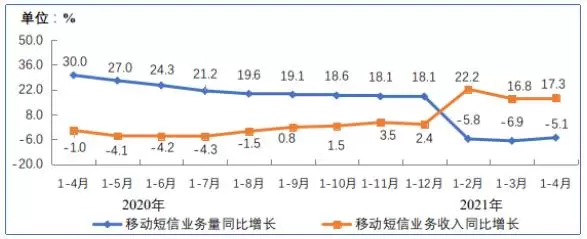 2020-2021年1-4月移动短信业务量和收入同比增长情况