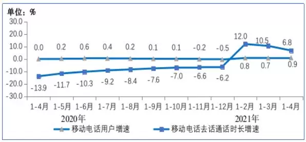 2020-2021年1-4月移动电话用户增速和通话时长增速