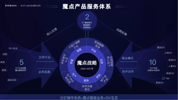 “2+5+10+N”的产品服务体系主要包含了2个基础能力、5大主导行业场景、10个ISV生态集成行业以及N个开发者生态。通过魔点的智能硬件和场景服务这2个基础能力,在校园、政务、社区等5个行业场景中形成主导和闭环,并通过和其他行业头部ISV合作,为酒店、工地、连锁、人事、税务、工厂等十大行业提供集成解决方案,另外还与N个开发者合作,为行业持续输出更多元的解决能力。