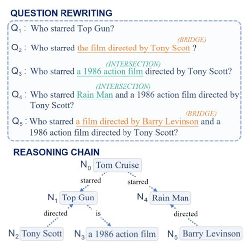具体来说,对于一篇给定的文本c和指定的问题推理层级d,该技术将先对其内容进行构图,然后从中抽取一条推理链,以此生成相关问题。先由一个简单问题生成器QGInitial生成一个初始问题,再使用另一个问题改写模型QGRewrite将其改写为一个更困难的问题。QGRewrite共将重复使用d-1次,从而将问题逐步改写为包含d层推理的复杂问题。在未来,该问题生成技术可用于为医保政策、医疗文献生成配套试题,测试相关人员的掌握程度。