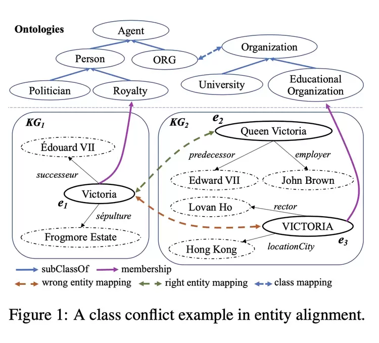 知识图谱表示学习常常用在知识图谱对齐任务上,但是目前的表示学习模型通常只会建模图结构信息、实体名称信息、实体属性信息,而没有考虑知识图谱的本体信息。本体定义了知识图谱的元信息以及实体的类别信息,在知识图谱及其应用中有重要作用。在论文中,天衍实验室提出了一种基于本体指导的知识图谱对齐模型(OntoEA),将知识图谱和本体层级信息共同进行建模,来发现并避免错误实体对齐中的类别冲突(class conflict)。天衍实验室提出的OntoEA模型在多个公开数据集和一个工业数据集(医疗知识图谱)上均超过了现有的知识图谱对齐模型,这也证明了引入本体信息的有效性。