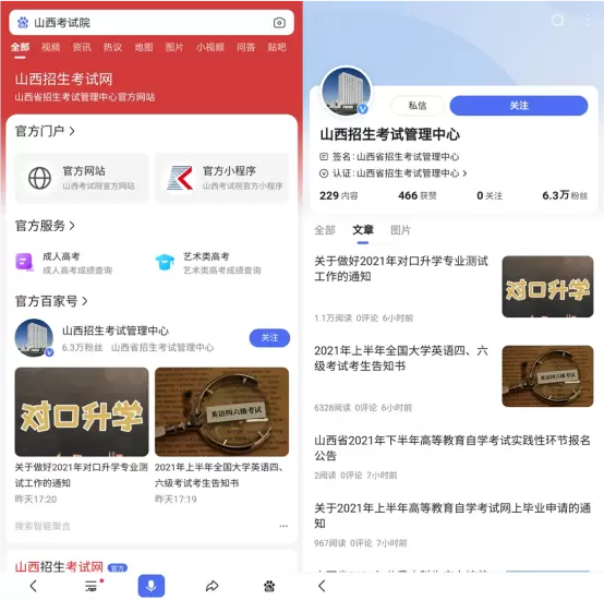 首先,百度今年引入了更多官方、权威机构,为考生提供权威及时的信息和服务。具体来说,百度在往年基础上引入更多高校、地方考试院开通官方百家号,并加大流量扶持,确保官方信息的及时发布、精准触达;同时,百度还通过“国家政务服务平台”智能小程序,以及与山西、内蒙古、山东、河南等各地教育考试院合作官方智能小程序,为考生提供政策公示、查分、录取查询等一系列官方服务。