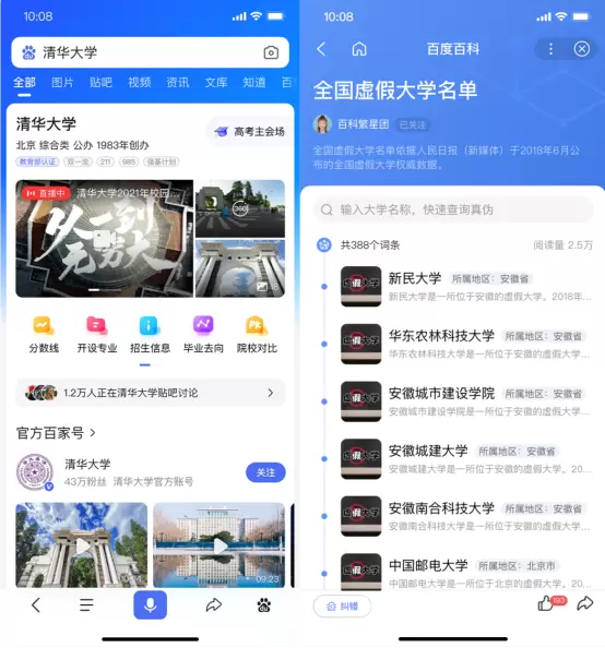 针对虚假官网、高考作弊工具等违法违规信息,百度成立专项进行识别清理,已累计处理332万违法违规信息。针对没有在教育部正规备案、容易让用户混淆的300多所大学,百度在搜索框和结果页上做了醒目的风险提示,帮助考生、家长放心搜索。