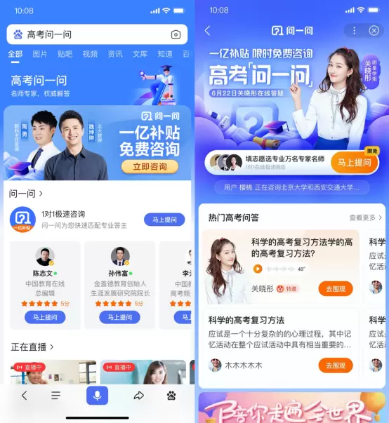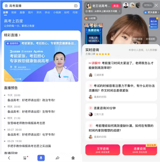 此外,为了进一步为考生提供专业、权威的高考政策解读、备考冲刺、志愿填报等信息,今年百度高考直播再度升级,邀请总计超过1500位名师入驻百家号,围绕备考、招生政策解读、志愿填报等话题推出超过1万场直播,为考生提供权威指导。今年,百度还创新性地启动咨询直播的形式,让用户可以直接连麦咨询名师和专家,解决个性化的问题。