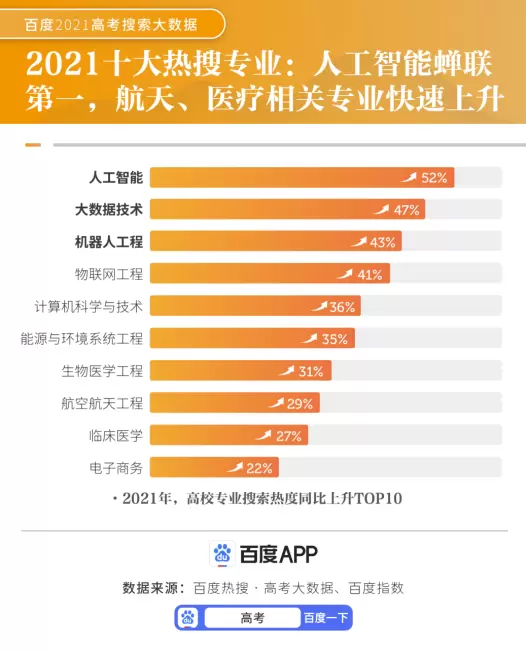 此外,百度还联合中国教育在线发布了《2021百度高考搜索大数据报告》,为考生及家长提供参考。报告数据显示,“新高考”成为今年高考话题中最热的议题之一。报告还汇总了2021年以来搜索热度增长最快的的十大热搜专业——人工智能蝉联第一,大数据技术与机器人工程入榜前三,越来越多的考生将未来职业规划锁定在了高科技产业方向。报告还囊括了考前热搜问题、热搜高校、热门报考因素等内容,为考生选择院校、专业等提供科学信息参考。考生及家长上百度App搜索“高考”即可查看报告完整内容。