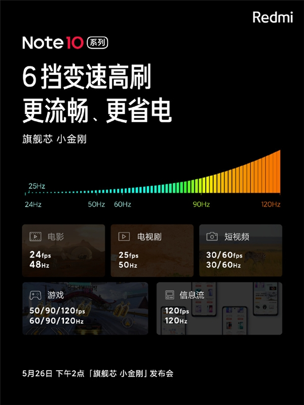 今天,红米又公布了更多产品细节。此次Note10系列将搭载120HZ高刷、240Hz高触控、6 挡变速的LCD屏幕。其中,6档变速高刷功能覆盖区间从24-120FPS,可在看剧或刷短视频时调节为24-60FPS,既能逐帧对应,又能避免高功耗;而在玩游戏和浏览信息流等需要高帧率的场景下,智能调节为50-120FPS,使画面更加细腻流畅。可以说,Note10的变速高刷屏幕能根据不同显示内容智能调节帧率,流畅和续航两不误。
