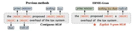 图1-1 连续 n-gram 掩码语言模型 vs 显式 n-gram 掩码语言模型