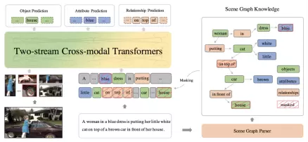 跨模态的信息处理能力需要人工智能模型深入理解并综合语言、视觉、听觉等模态的信息。当前,基于预训练的跨模态语义理解技术,通过对齐语料学习跨模态的联合表示,将语义对齐信号融合到联合表示中,从而提升跨模态语义理解能力。ERNIE-ViL提出了知识增强的视觉-语言预训练模型,将包含细粒度语义信息的场景图(Scene Graph)知识融入预训练过程,构建了物体预测、属性预测、关系预测三个预训练任务,使得模型在预训练过程中更加关注细粒度语义知识,学习到能够刻画更好跨模态语义对齐信息,得到更好的跨模态语义表示。