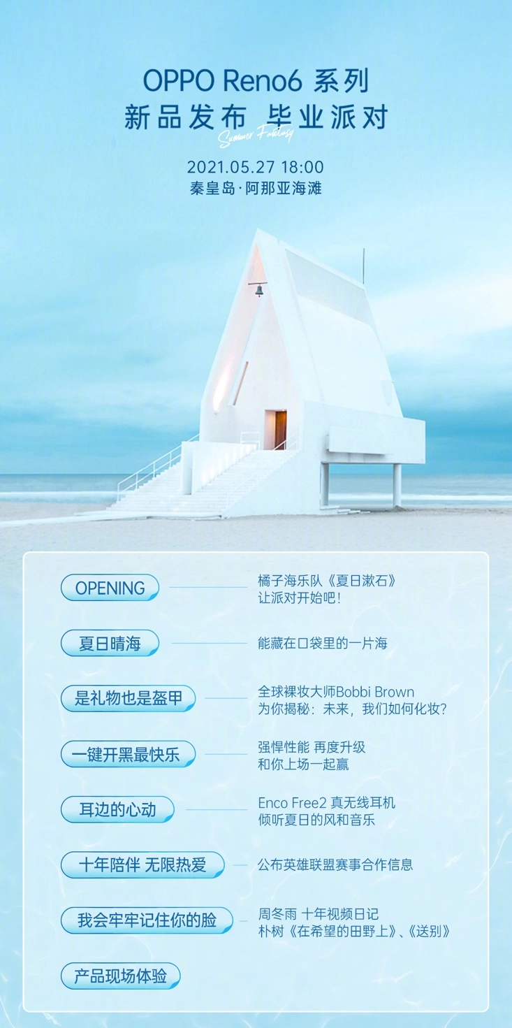 不得不说,此次海边发布会还是非常值得期待的,除了主题契合六月的毕业季,在发布会上,还有橘子海乐队、朴树、裸妆大师Bobbi Brown等助阵发布会。在游戏环节,还有程潇、周洁琼带队PEL明星选手的游戏专场,揭秘新一代和平精英职业联赛赛事指定用机OPPO Reno6 Pro+的秘密。更重要的是,周冬雨十年视频日记,也将在发布会上首映。