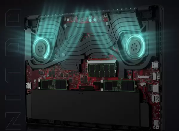 而双风扇六热管四出风口与液态金属导热加持的冰川散热架构2.0,保证了笔记本快速散热,长时间高负载运行无忧。