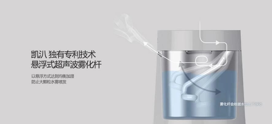 “悬浮式超声波雾化杆”是CarePod凯汃加湿器专利技术,很多人使用加湿器时候会发现桌面地面都会有残留水迹,容易打湿物品和地板。CarePod凯汃加湿器的雾化技术,以悬浮方式达到均衡加湿,防止大颗粒水雾喷发,45度喷雾不打湿桌面及其他家具。