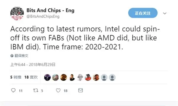 意大利媒体BitChips官推近日曝出一条猛料,声称根据自己在晶圆厂工作的朋友送上的线报,英特尔计划剥离自己的晶圆厂,时间在2020-2021年。