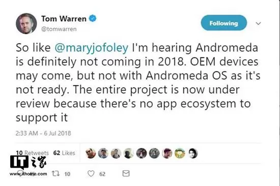 The Verge编辑TomWarren 在Twitter上表示,“我听说Andromeda肯定不会在2018年问世,OEM设备可能会出现,但Andromeda OS还没有准备就绪。现在微软正在审查整个项目,因为没有应用程序生态系统来支持它。”