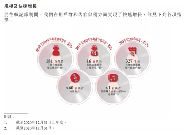 在港交所披露的招股书中提到,网易云音乐月活跃用户量达到1.81亿,在线音乐付费用户量达到1600万,平台近两年在线音乐付费用户分别保持同比105%、85%的高速增长。这将是平台未来收入持续增长的保障。对比2020年度付费率来看,网易云音乐位居国内行业第一。