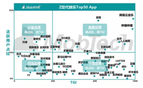 好在音乐的复苏正好也赶上了“Z世代”(95-00后)的崛起,作为互联网的原住民,他们天然的亲近网络社区,也更熟悉互联网创作和互动。而且,相对较年轻的网易云音乐又深受年轻人的青睐。据Mob研究院《Z世代大学生图鉴》,网易云音乐以高活跃用户占比和高TGI(偏好度)成为最受Z世代大学生欢迎的娱乐APP。在中国年轻一代中,网易云音乐已是一个被广泛认可和欣赏的文化符号。