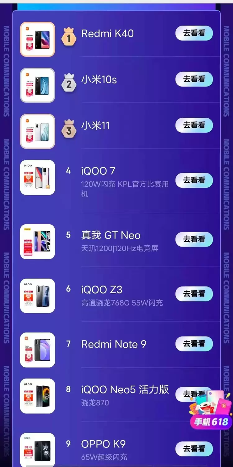 618预售热度榜出炉,iQOO成小米最强竞争对手