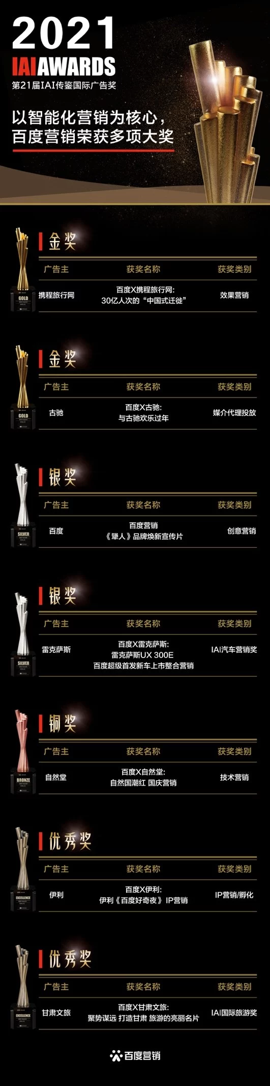 5月28日,第21届IAI国际广告奖颁奖典礼上,百度营销选送的《百度×中国携程网:30亿人次的“中国式迁徙”》斩获效果营销类金奖,《百度×古驰:与古驰欢乐过年春节营销》斩获媒介代理投放类金奖。此外,《百度×自然堂:自然国潮红》、《百度×雷克萨斯:雷克萨斯UX300e百度超级首发新车上市整合营销》、《百度营销<犟人>品牌焕新宣传片》等5个营销案例也分别揽获技术营销、IAI汽车营销奖、影视及宣传片奖等奖项。