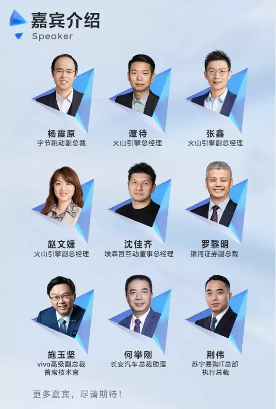 发布会上,火山引擎除了邀请到了字节跳动副总裁杨震原外,还邀请到了金融、零售、泛互等行业的企业高层,例如:埃森哲互动董事总经理沈佳齐、银河证券副总裁罗黎明、vivo高级副总裁施玉坚、长安汽车总裁助理何举刚、苏宁易购IT总部执行总裁荆伟、赫基集团副总裁李昕等。