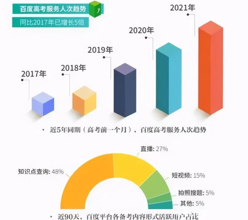 3、同比2017年,2021年百度高考服务人次就飙升了500%。其中,查询知识点的人最多,占比48%。