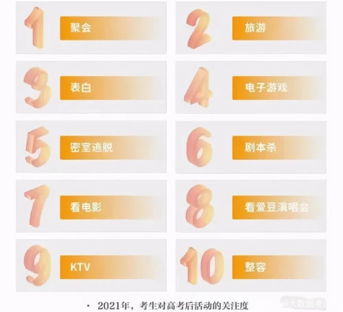 4、据百度2021高考搜索大数据显示,考生高考后最想做的三件事分别是聚会、旅游、表白。