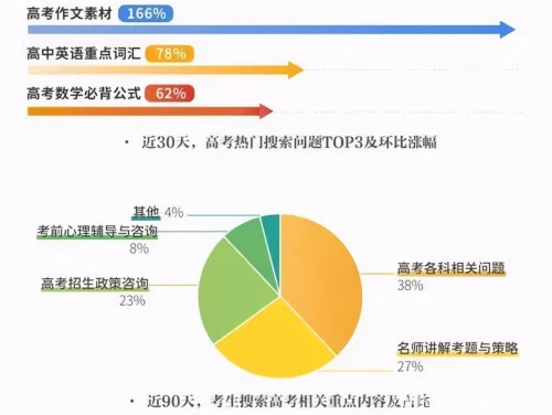 2、考生搜索高考作文素材最多,暴涨了166%,成为“查漏补缺”的重点。其次就是英语重点词汇和数学必备公式,分别占比78%和62%。
