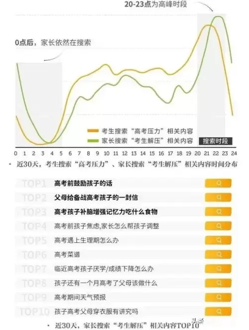 5、据百度2021高考搜索大数据显示,家长考前普遍忙于给考生解压,“00后家长”比孩子压力更大。