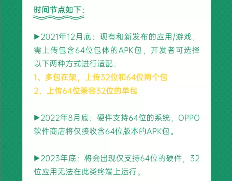 OPPO软件商店在其官方渠道公布了64位架构升级支持的具体时间节点,同时为了帮助开发者顺利完成架构升级,OPPO软件商店宣布支持64位应用上架,并发布了应用适配教程与功能使用手册。