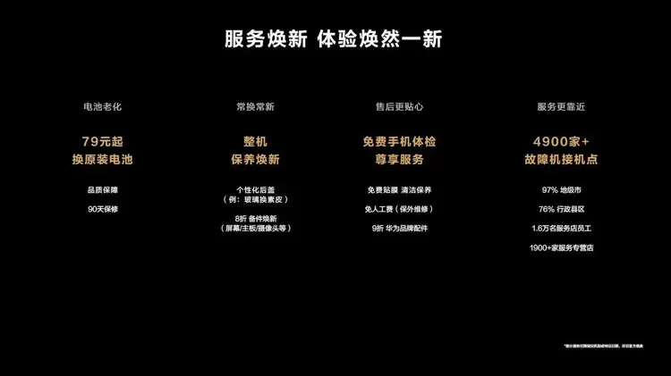 华为的服务焕新还可以为用户提供免费手机体检尊享服务,免费贴膜清洁保养、免人工费(保外维修)、9折华为品牌配件等更全方位的售后服务内容。