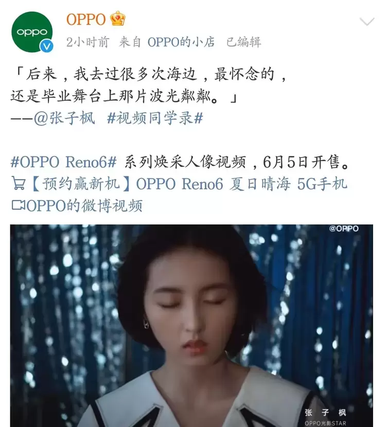 线上线下联动,OPPOReno6系列手机6月5日奔赴而来。临近发售,知名新生代青年演员张子枫诚邀粉丝们共同参与此次“视频同学录”大赛,OPPO微博小店、官网、电商商城、线下门店等多种渠道已向粉丝们正式开放,参与本次赛事活动,更有多重惊喜好礼等各位来拿!