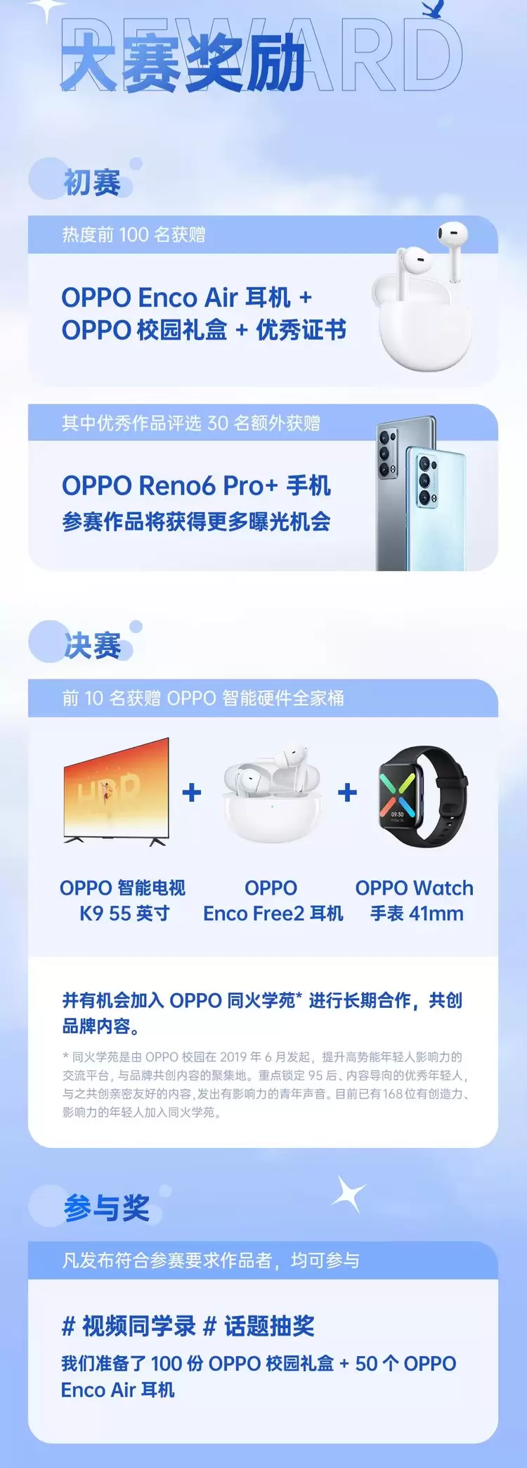 据OPPO官微信息,目前,Reno视频同学录大赛正火热进行中,OPPO校园联合微博以及国内百家高校共同参与,诚邀来自全国各地的学子加入这个趣味比赛当中。参赛者只需用手机拍下自己所在校园的趣味视频并在微博上带#视频同学录#话题发布,就有机会赢得好礼。OPPO Enco Air耳机、OPPO Reno6 Pro+新品手机、OPPO智能硬件全家桶等等,海量礼品真是无比诱人,只要参赛,就有好礼可以拿哦。